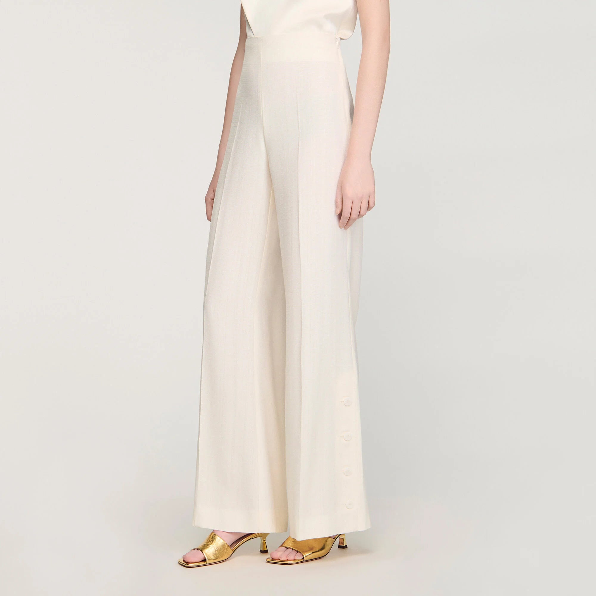 Straight, wide-leg plain trousers with a high waist, side zip fastening and buttoned slits at the hems.